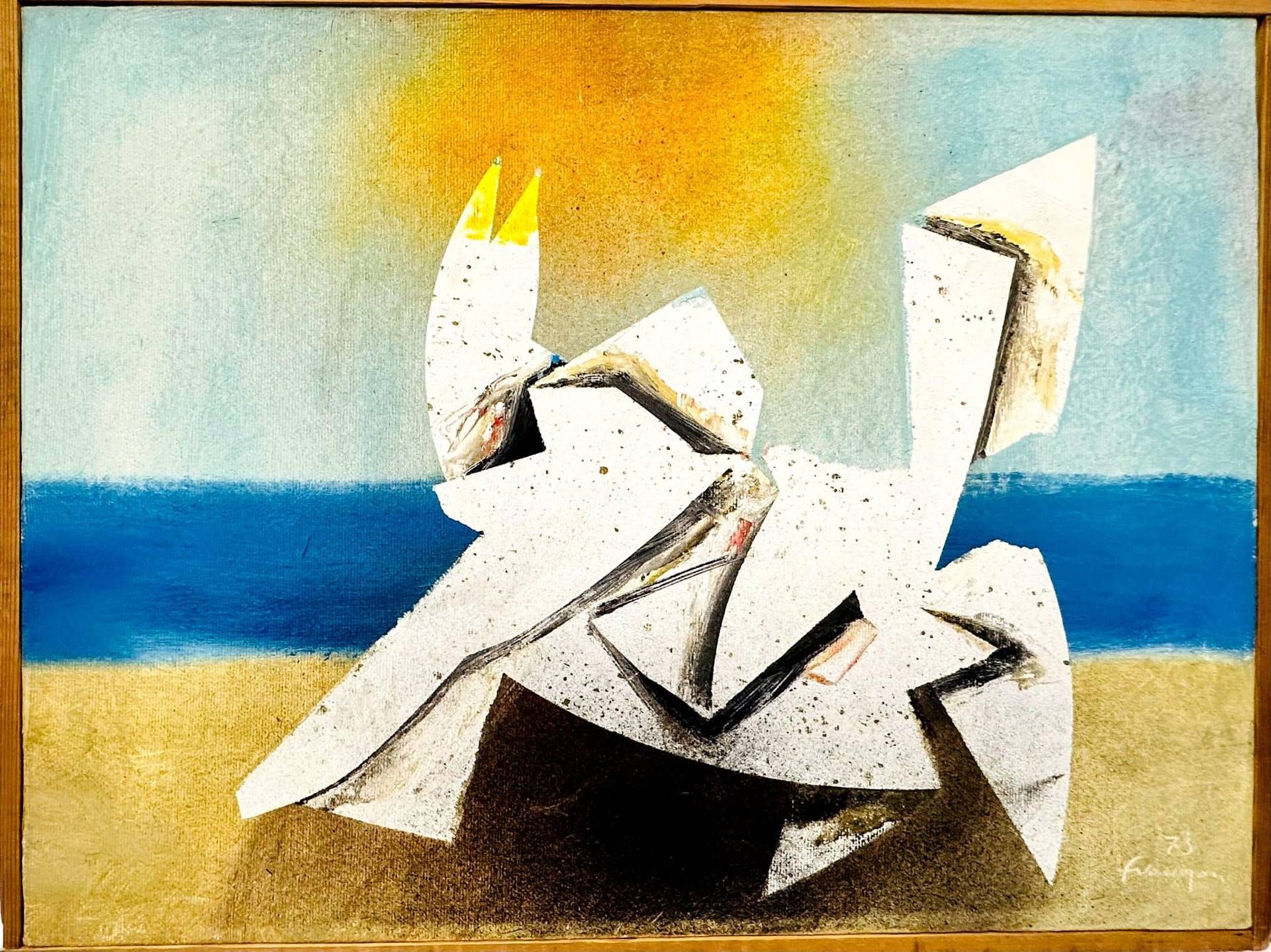 Umberto Croppi writes: “Rome represents, for Vaccarone, the arrival at a synthesis between the avant-garde and the great Italian pictorial and engraving tradition. While he worked as an engraver, he did not abandon his pictorial practice: indeed, those were the years in which he began the most significant cycles of his production, those which he dedicated to the ‘Seagulls’ and the ‘Clochards’. It is in this series of works that he defines his very personal profile in a form of semi-abstractism, following two parallel lines. The theme of Ligurian origins, symbolized in the flight of sea birds, a sign of movement and freedom, and the urban theme of marginalization and defeat, which also implies an ironic streak, which will be a constant in the life as well as in the poetics of the master”.