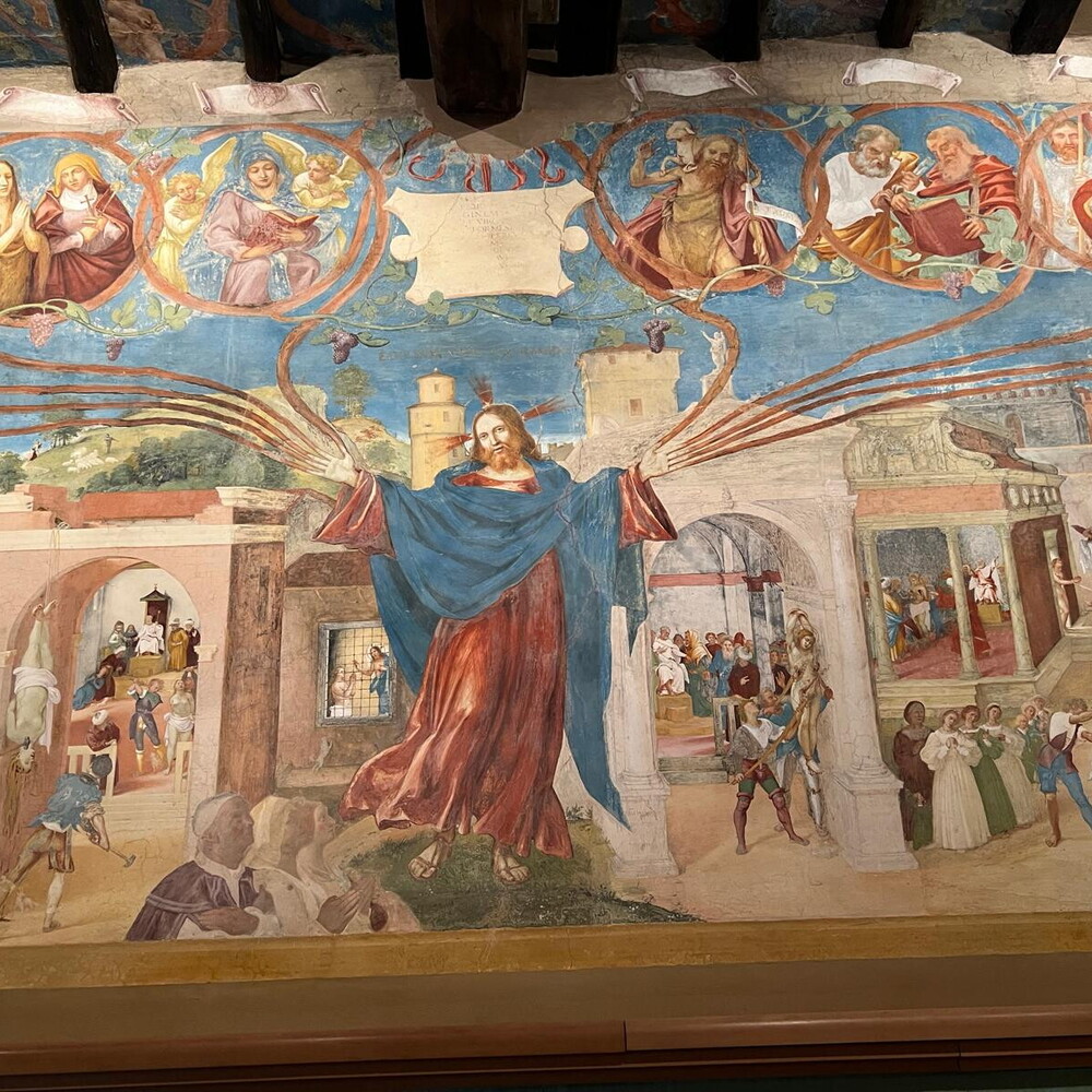 At the entrance of the chapel you meet Lorenzo Lotto, in a self-portrait dressed as a hunter of birds carrying an owl and a bundle of rods on his shoulders: the metaphor refers to the danger of being deceived by the lure of heresy which can turn out to be a trap. On the right wall he hits for spirituality and symbolism the masterpiece of the oratory: the depiction of Christ as a vine with the branches that start from his hands and wrap around ten spirals high with the images of the Saints, while two ladders rest against the outermost branches from which grape harvesters fall carrying billhooks and sickles in their hands.