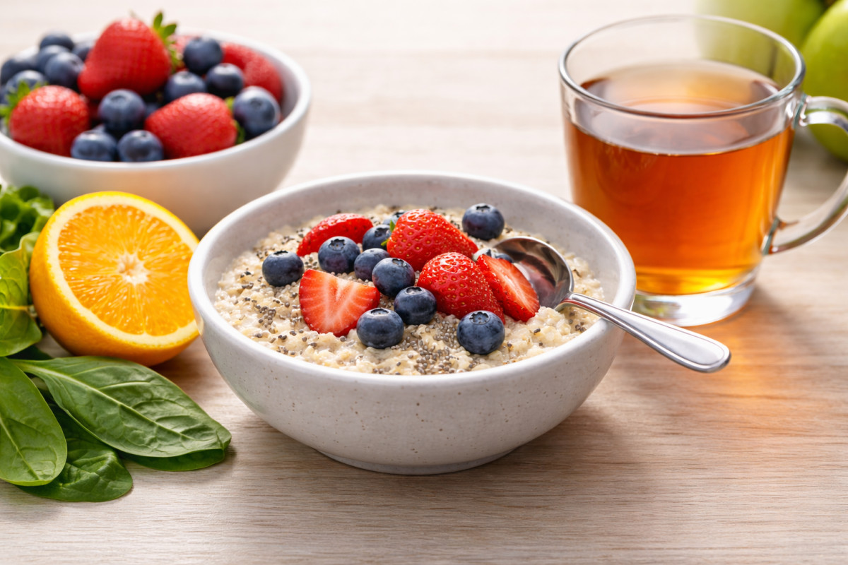 For example, you can start the day with a bowl of oatmeal with blueberries and strawberries, eat an orange as a snack during the day and add green vegetables such as kale or spinach to dinner.