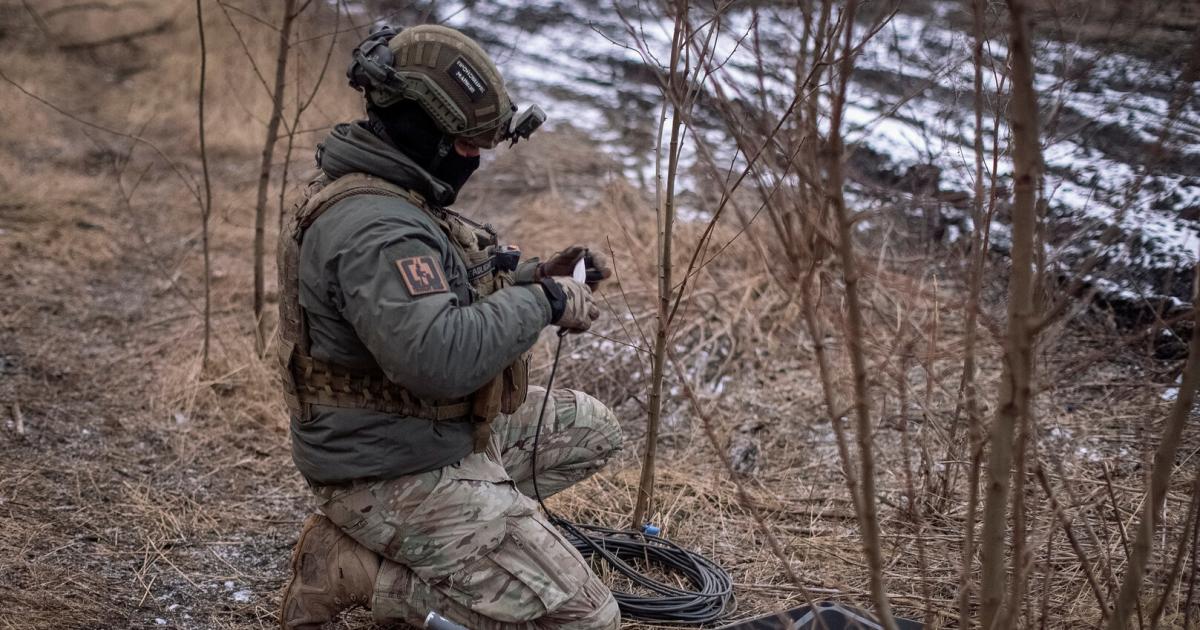 Ukrainian soldiers set up a Starlink terminal near the front