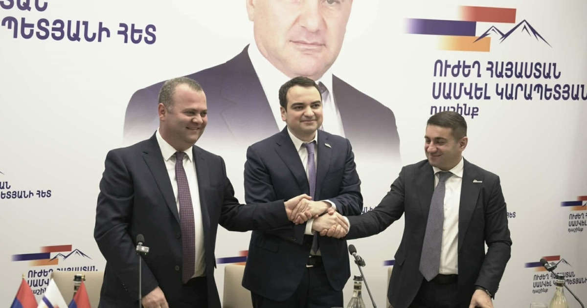 Today, the member of the board of the “Strong Armenia” party, Narek Karapetyan, signed a memorandum on the creation of the alliance with the chairman of the “New Era” party Harutyun Harutyunyan and the honorary chairman of the “United Armenians” party, authorized representative Nairi Sargsyan.